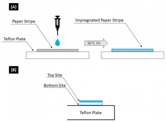 For the formation of CMC–paper composites, eucalyptus paper is impregnated with an aqueous CMC solution and dried afterwards on a Teflon® plate in an oven, as described in Section 2.3. During the drying of the CMC–paper composite, i.e., the evaporation of the solvent, polymer mass transport takes place [41]. Since paper strips impregnated with CMC are placed on a Teflon plate during the drying process, most of the water evaporation takes place only on the upper side of the paper strip. Capillary forces then continue to transport water and, thus, CMC to the upper side of the paper strip. This results in a polymer gradient along the z-axis, as shown in principle in Figure 1B.