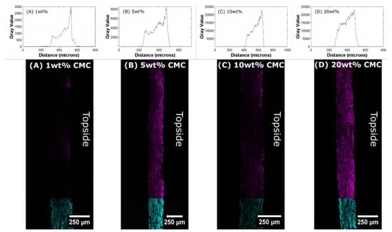 These thin paper samples enable the investigation of the polymer gradient in cross-section of the paper via fluorescent CLSM and are shown in Figure 3A–C. These CLSM images and the grey values obtained from the images for paper samples have respective CMC contents of 1 wt%, 5 wt%, 10 wt% and 20 wt% relative to the weight of the sample. The related grey values plotted above the CLSM images are showing the CMC distribution in the cross section.