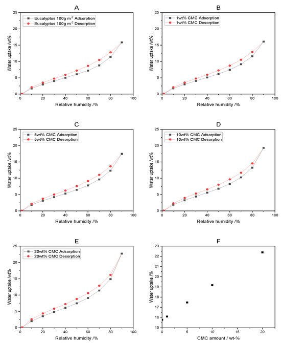 Dynamic water vapor adsorption and desorption, respectively, of eucalyptus paper samples with varying CMC contents (A–E) and water uptake levels at 90% RH for paper–CMC composites. Graph (F) shows the water uptake at 90% RH for CMC–paper composites.