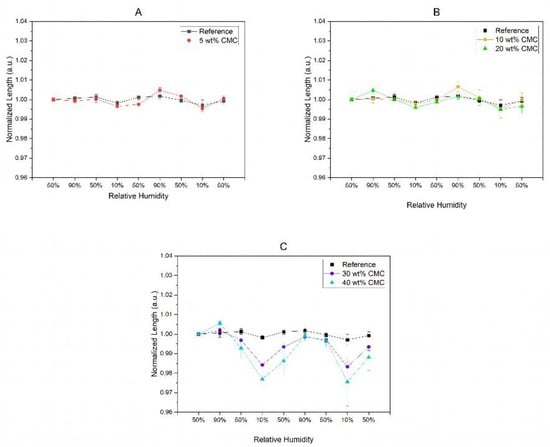 As Figure 5 shows, the effect of the length change becomes much more pronounced when the RH is decreased to 10%. Paper samples with high concentrations of CMC showed length changes of about 2.5% (in the case of 40 wt% CMC) and about 1.5% (in the case of 30 wt% CMC) at 10% RH compared to the significantly less pronounced hygroexpansion of native paper samples. Thus, a reduction in humidity has a significantly stronger impact on the changes in the lengths of the paper strips compared to the untreated paper samples. CMC molecules located in the macro pores of the paper network and pre-swollen in high humidity can increase fiber–fiber bond strength by increasing the relative bonded area similar to other macromolecules [46,47]. If CMC is shrinking due to a humidity decrease, paper fibers connected to the swollen CMC-chains in the macropores are pulled together, resulting in an overall reduction in length.