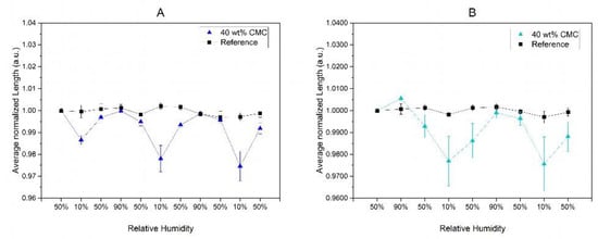 Length changes due to the hygroexpansion of paper strips impregnated with 40 wt% CMC. When paper strips after acclimatization at 50% RH were first exposed to high humidity of 90% (A), the change in length at low humidity of 10% is significantly larger compared to paper strips treated with 10% RH without prior treatment at 90% RH (B).