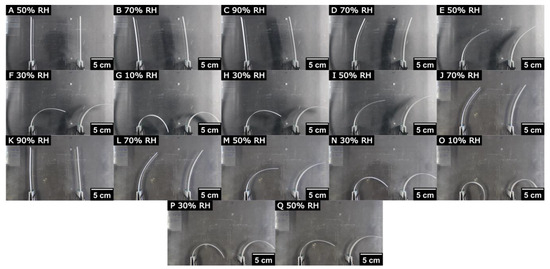 Humidity-responsive bending of paper bilayers with a CMC–paper layer with 40 wt% CMC. Here, paper bilayers are shown from a top view. For reproducibility, two samples are investigated at the same time. The first images (A–C) show the initial wetting phase with high humidity. In the next step (D–G), the humidity is decreased subsequently to 10% RH, resulting in the bending of the paper bilayers. In the following images (H–P), the sequence of humidity treatment is repeated, stopping at the initial settings of 50% RH (Q).