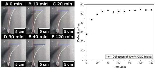 Due to the water uptake of the CMC and, thus, the expanding length of the CMC–paper layer, the bilayers first bend slightly to the left side when treated with high humidity. As mentioned before, we hypothesize that the swollen CMC macromolecules fill the macropores of the paper network first and, therefore, only slightly change the layer length and bending of the paper bilayer. After treatment at 10% RH, the humidity inside the chamber is returned to 90% RH successively, causing the paper strips to return to their original positions. Note that the original position of the paper bilayer is not reached at a humidity of 50% but only at a rewetting at 90% RH. The images show the paper bilayers in the equilibrium state at the end of each humidity step. To ensure the equilibrium state of bilayer bending, the time for every humidity step was set to 2 h. However, the actual bending movement only takes several minutes, as shown in Figure 8. Here, the deflection of the paper strip is determined via image analysis and shows that the bending movement of the paper bilayers during the humidity change of 70% to 50% RH is already finished after approximately 30 min, highlighting the rapid response of this bilayer material. To further improve the response times of paper bilayers, future studies will focus on the time dependence of the bending behavior.