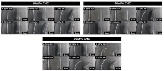 Bending behavior of paper bilayers with varying CMC concentrations given in inserts above the photographs. The relative humidities denoted as inserts to individual photographs were varied from 50% (A, F) to 90% (B, D) and 10% (C, E), respectively.