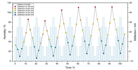 At a closer look, the deflection in dry-environment-responsive humidity increases after the first three humidity cycles and then remains constant. The reason for this is the previously applied preload and drying stress during the drying process of the bilayer formation, which is resolved after the first wetting process at high humidity. The position of the paper bilayer at high humidity (90% RH) is influenced in the same manner. Note that the bilayers show no deflection at the start of the humidity treatment at 50% RH, while in the following humidity cycles, the bilayers are bent at 50% RH.