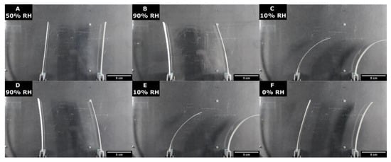 To investigate the bending behavior of paper-based bilayers in response to humidity, two identical paper bilayers are placed in a polymethylmethacrylate (PMMA) box equipped with a humidity controller with the help of clamps, as shown in Figure S2, and the environmental conditions inside the PMMA box are adjusted with an attached humidity controller. The humidity treatment involves a sequence of humidity levels after starting at 50% RH, then rising stepwise to 90% RH, followed by a stepwise decrease to 10%. This humidity treatment is repeated once (the detailed RH program is described in Section 2.7 and shown in Figure S3). Due to the different hygroexpansion coefficients, the paper bilayers are bending during the humidity treatment, as shown in Figure 7. Here, the side view of the paper layers is shown with the CMC–paper layer positioned on the right side and the untreated paper layer on the left side. Based on the hygroexpansion experiments that indicate significant benefits for the bending movement when the paper layers are subjected to high humidity (90% RH) prior to dehydration at 10% RH, the humidity treatment starts with an increase in humidity to 90%.