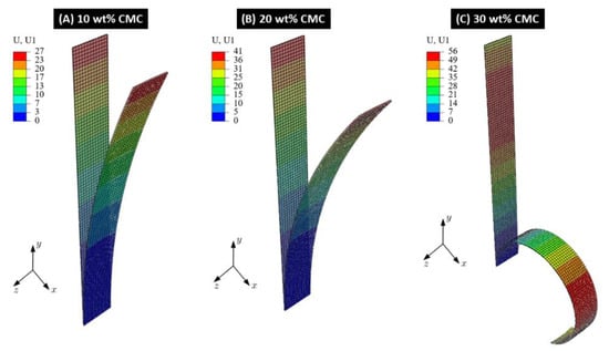 For comparison of experimental and FEA results, Figure 13 shows the deflection determined via the FE model of paper bilayers impregnated with 10, 20 and 30 wt% CMC, respectively. Here, the bending behavior of the paper bilayer with 10 wt% CMC can be described reasonably using the FE model. Here, the deviation from the observed experimental results to the FEA results is approx. 15%. However, this deviation increases with CMC concentrations above 20 wt% due to the nonlinear increase in the determined hygroexpansion coefficient (Figure S1). Therefore, the FE analysis for strips with CMC concentrations above 20 wt% reveals that the paper strips start curling up to form a circle. In contrast, only a semicircle shape is observed in the experiment. The rolling behavior cannot be obtained from simulations with shell elements. While the numerical predictions and the experimental data show identical trends for the CMC concentration 10 wt%, the assumption of the simulation of a moisture-independent hygroscopic expansion coefficient is no longer sufficient at CMC concentrations of 20 wt% and above. An accurate numerical simulation of the paper bilayers considered here requires a deeper investigation into the moisture-independent material properties, which is outside the scope of this investigation and planned for the future.