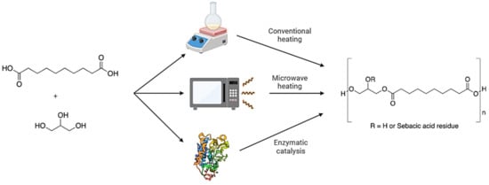 Glycerol and sebacic acid can be polycondesed to PGS pre-polymer applying three different methods, namely conventional heating, microwave heating and enzyme-catalysed synthesis using CALB enzyme. The end product is a mixture of polyester chains, both having a linear and branched structure (created in https://www.biorender.com/).