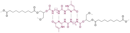 Wu and co-workers firstly designed a supramolecular derivative of PGS by grafting ureido-pyrimidinone (UPy) to the polymer’s backbone (Figure 4). First UPy-HDI synthon was synthetised by reacting 0.02 mol of 2-amino-4-hydroxy-6-methylpyrimidine with 0.14 mol of HDI at 100 °C for 16 h, under N2. UPy-HDI was then precipitated with penthane and dried, before being reacted with the PGS prepolymer at different ratios of 2:10, 3:10, 4:10, and 5:10 in DMF and in presence of a stannous octoate catalyst at 85 °C for 12 h. PGS-graft-UPy (PGS-U) was then precipitated in diethyl ether and dried in vacuum conditions before use. FTIR and H-NMR confirmed the grafting of UPy showing, respectively, absorption bands at 1580 and 1660 cm−1 characteristic of amide groups, and a band at 3120 cm−1 from urethane–NH groups; additionally, peaks at 2.25, 11.91 and 13.14 ppm correspond to the protons of UPy segments, and the signals at 5.26 ppm arise from the urethane proton of HDI segments. To prove the hydrogen bonding formed between UPy dimers, viscosity analyses were performed, showing a large increase in viscosity, hence cohesion, when increasing the UPy ratio. Moreover, PGS-U films obtained by solvent casting showed tensile strength and YM up to 4.6 ± 0.2 MPa and 32.8 ± 0.5 MPa, respectively, while a crosslinking density up to 4413 ± 62 mol/m3 was calculated; higher elongation between 500% and 610% was obtained by grafting UPy at 3:10 or 4:10 ratios. In addition to adjustable mechanical characteristics based on the UPy content, PGS-U elastomers showed efficient self-healing and quick shape–memory capabilities, demonstrated to be suitable for the preparation of biomimetic scaffolds, controlled drug delivery systems, surface antibacterial composites, and cell co-culture systems [].