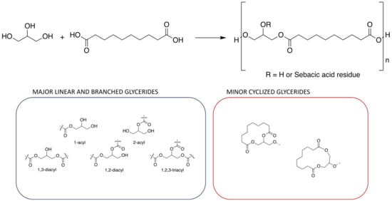 - Perin, G.B.; Felisberti, M.I. Enzymatic Synthesis of Poly(Glycerol Sebacate): Kinetics, Chain Growth, and Branching Behavior. Macromolecules 2020, 53, 7925–7935. [Google Scholar] [CrossRef] [PubMed]