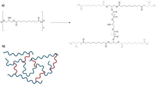 (a) Crosslinking reaction between pre-PGS molecules that leads to the formation of insoluble elastomeric PGS. (b) Crosslinked network in PGS elastomer; main chains are depicted in blue, while crosslink chains are red (created in https://www.biorender.com/).