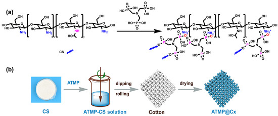 Chitosan (CS; Mn = 200,000; deacetylation degree of 85.0%) was procured from Macklin Biochemical Reagent Co., Ltd. (Shanghai, China). Amino trimethylene phosphonic acid (ATMP; 50 wt.% solution) was purchased from Innochem Technology Co., Ltd. (Beijing, China). Cotton fabric (100%, 170 g/m2) was provided by Hong-da Weaving Factory (Dongguan, China). All chemicals were utilized as received without further purification.