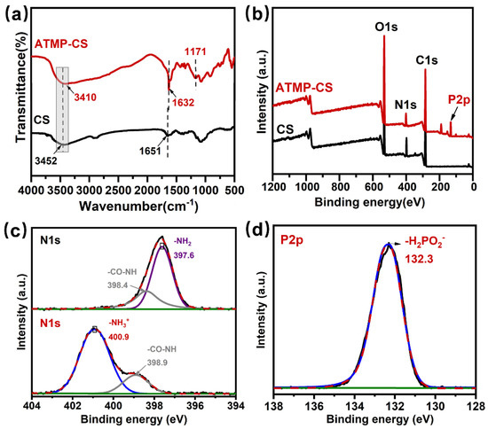 FT-IR spectra of CS and ATMP-CS (a). XPS spectra of CS and ATMP-CS (b), N1s spectra of CS and ATMP-CS (c) and P2p spectra of ATMP-CS (d). (The black solid line and red dashed line in (c) and (d) respectively represent the actual test results and fitting results, while the fitting peaks are denoted by purple, gray, and blue solid lines).