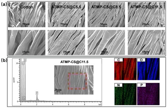 SEM images of cotton and ATMP-CS@Cx fabrics (a). Mapping and EDS images for ATMP-CS@C11.5 fabric (b) (The output area of the red dotted frame is the EDS scanning range).