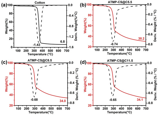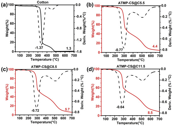 TGA and DTG curves of cotton (a), ATMP-CS@C5.5 (b), ATMP-CS@C8.5 (c) and ATMP-CS@C11.5 (d) in nitrogen atmosphere (The solid black line represents the TGA curve of cotton, while the solid red line represents the TGA curve of ATMP-CS@Cx fabrics and the dotted line represents the DTG curve).