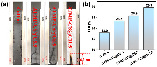 Prior to its utilization, the cotton fabric was soaked in a 1.0 mol/L NaOH solution at 100 °C for 1 h, followed by three rinses with deionized water to eliminate residual alkali on the surface, and subsequently dried at 80°C until it reached a constant weight. The preparation process is illustrated in Figure 1b. By calculating the liquid-carrying rate of the fabric, precise control was exercised over its weight gain within the measurement range. The cotton fabric was uniformly coated with the ATMP-CS coating using the dipping–rolling–drying process and then dried at 80°C. To minimize the impact of environmental humidity on fabric weight, the sample was weighed within a 30 s timeframe. The flame-retardant treated cotton fabric is denoted as ATMP-CS@Cx, where “C” represents the cotton fabric and “x” represents the load capacity of ATMP-CS on the cotton fabric (5.5 wt.%, 8.5 wt.%, and 11.5 wt.%).