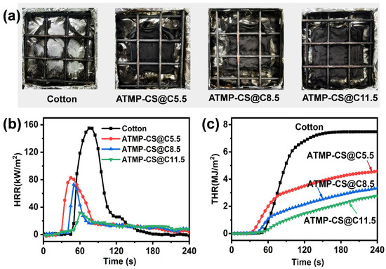 Digital photos for cotton and ATMP-CS@Cx samples after CCT test (a). HRR curves (b) and THR curves (c).