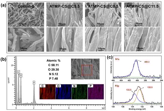 SEM-EDS and XPS techniques were further employed to analyze the surface morphology and chemical composition of the char residues. From the SEM image of residual ash in the cotton fabric, it is evident that the fabric structure was completely destroyed, with fibers fracturing and giving rise to a hollow and voluminous carbon residue. In contrast, even after the CCT test, ATMP-CS@Cx fabrics maintained their fabric structural integrity and pristine fiber continuity impeccably, appearing devoid of any fractures. Furthermore, a bubbling layer of expanded carbon can be distinctly observed on the surfaces of the residual fibers; it becomes increasingly prominent as the load augments. Additionally, as depicted in Figure 9b, the elements C, N, O, and P exhibit a distinctive fibrous distribution pattern [46], suggesting that these four elements are uniformly distributed on the surface of the ATMP-CS@Cx fabrics. The continuous film layer formed by the ATMP-CS coating, enveloping each individual fiber, facilitates prompt carbonization and exhibits a remarkable expansion flame-retardant effect. As a result, it leads to the formation of a dense carbon layer that effectively isolates combustible gases from the surrounding air and heat, thereby impeding further combustion reactions to protect the fibers. The chemical composition of the ATMP-CS@C11.5 fabric carbon residue after the CCT test was detected using XPS technology. Figure 9c shows the XPS spectrum. The presence of C, N, O and P elements in the carbon residue can be observed from the overall spectrum. The N1s spectra showed that nitrogen occurred mainly in the form of pyridine nitrogen (400.3 eV). The P2p spectra show that the binding energy of 133.5 eV corresponds to the characteristic peak of metaphosphate. The results show that nitrogen and phosphorus are involved in the process of carbonization and the formation of a carbon layer on the coated fabric. The results of an analysis of gas-phase decomposition products and residues indicate that the ATMP-CS coating predominantly contributes to the flame-retardant effect in the condensed phase.