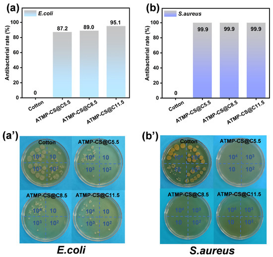 Antibacterial rates of cotton and ATMP-CS@Cx samples (a,b) and petri dish photos (a’,b’).