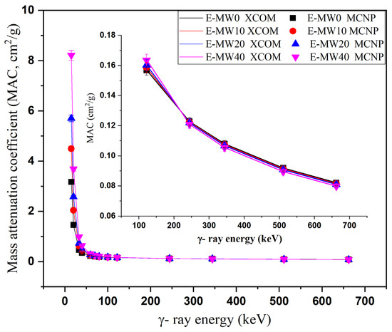 Figure 3 shows the effects of γ-photon energy on the simulated MAC for the fabricated E-MW samples over a photon energy interval ranging from 15 to 662 keV. In the aforementioned energy interval, the γ-photons interact with the composite electrons with two different interaction modes (i.e., photoelectric interaction (PE) and Compton scattering (CS)). Over the low energy interval from 15 to 122 keV, the PE interaction is the leading one. Since the cross-section of the interaction within the PE interval varies with E−3.5, a large reduction in MAC was observed for all fabricated composites in Figure 3. Increasing the photon energy from 15 to 122 keV causes a reduction in MAC between 3.175–0.159 cm2/g (for E-MW0 composite), 4.496–0.159 cm2/g (for E-MW10 composite), 5.702–0.160 cm2/g (for E-MW20 composite), and 8.212–0.164 cm2/g (for E-MW40 composite). The inset of Figure 3 shows the variation of MAC versus γ-ray energy over the CS interval, which extends from 244 to 662 keV. Due to the proportionality of the CS cross-section with E−1, an exponential decrease in MAC was observed. The MAC decreased between 0.123–0.082 cm2/g (for E-MW0 composite), 0.122–0.082 cm2/g (for E-MW10 composite), 0.122–0.081 cm2/g (for E-MW20 composite), and 0.121–0.080 cm2/g (for E-MW40 composite) as the photon energy increased between 244 and 662 MeV, respectively. Polymeric materials are unsuitable for shielding the high-energy γ-photons, which is the main reason for selecting the energy interval between 15 and 662 keV. Figure 3 also shows an agreement between the simulated data with the MCNP-5 code and those calculated with the Phy-X/PSD program. The difference between the two results was within ±2%. The simulated LAC for the fabricated samples was then compared with the experimentally measured LAC for the fabricated composites at γ-ray energies of 59.5 keV, 80 keV, and 662 keV, as shown in Table 2. The difference between the simulated and experimental results is high for the Ba-133 radioactive source with an energy of 80 keV, where the difference varied between 8–15%. This high difference can be attributed to the low activity of the source used and to errors in the chemical composition of the fabricated composites. Then, for the radioactive sources Am-241 (59 keV) and Cs-137 (662 keV), the difference between experimental and simulated data was in the range of ±10%.