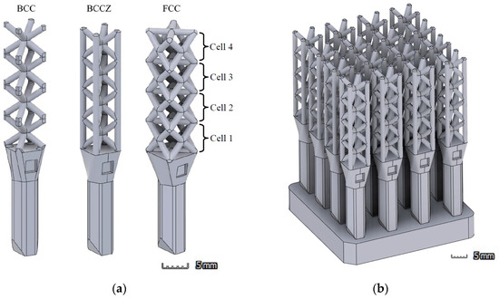 (a) Individual probes of each cell typology: body-centered cubic (BCC), body-centered cubic with vertical struts (BCCZ), and face-centered cubic (FCC); (b) 4 × 4 × 4 assembly (BCCZ).