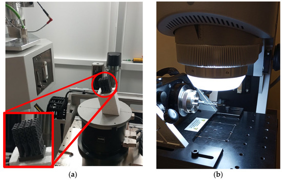 First evaluation of the assemblies was performed by XCT Zeiss Metrotom 800 G3/225 kV, using integrated software Metrotom OS 3.12 (Zeiss, Oberkochen, Germany). A total of 5 iterations were taken for each assembly. After XCT evaluation, individual probes were separated from the solid base and measured by focal variation microscope—InfiniteFocusSL, from Alicona—using an incorporated rotary plate that allows obtaining a 360° scan along a horizontal axis and integrated software IfMeasure Suite 5.3.6 (Alicona Imaging, Graz, Austria). Disposition of the test objects for the evaluation in XCT and FVM is displayed in Figure 2.