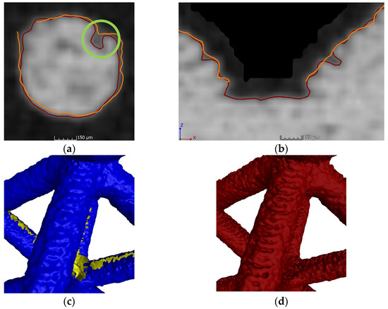 A 2D slice comparison of FVM (orange) and XCT (red) surface reconstruction over grayscale map. (a) BCCZ vertical strut; (b) FCC transversal cut of a node; (c) 3D details of the FVM surface of a BCC strut (yellow areas represent holes); (d) 3D details of the XCT surface of a BCC strut.
