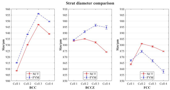 The first analysis was performed by comparing the evaluation of a single probe of each lattice typology using both devices. The mean values of the struts’ diameters were grouped by cell unit, following the scheme shown in Figure 1a. A comparison of the mean values obtained from the XCT and FVM evaluation for each lattice typology are displayed in Figure 6, including standard deviations of the results (error bars).