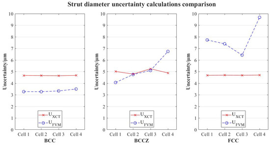 The results show higher repeatability of the values obtained in XCT measurements of the diameter of the struts, with significantly lower standard deviations and good uncertainty values. A trend was observed in FVM evaluation, as higher deviations from XCT as well as lower repeatability were registered for upper cells. Errors are most likely caused by reconstruction of the volume, as the rotation axis is not totally aligned with the horizontal axis; this “cone-effect” is less evident in the BCC lattice, matching with the higher amount of data obtained in the characterization.