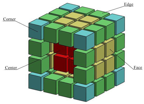 A second analysis was performed regarding strut diameter evaluation. In a complete lattice, cells were divided according to their location in the 4 × 4 × 4 structure, as it is shown in Figure 8, and grouped in 4 different positions: corners, faces, edges, and centers.