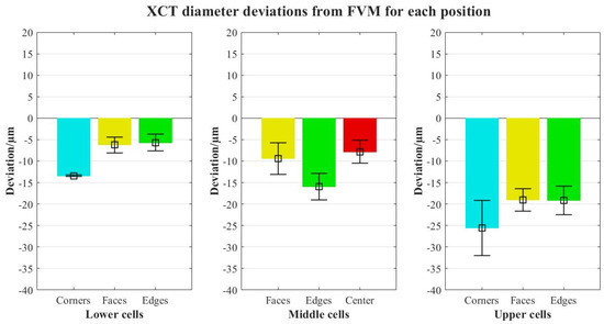 Analysis of the deviations according to cell position along the 4 × 4 × 4 structure has revealed similar trends, with no additional differences apart from reconstruction errors in FVM mentioned before. This shows that no higher dimensional errors are found in the XCT evaluation of inner cells of the lattice, therefore suggesting that the accuracy of inner cell XCT measurement does not decrease, and reference measurements taken in outer cells may be representative of all of the structure. However, this must be taken with caution, as this experiment was performed with a particular methodology and for polymers.
