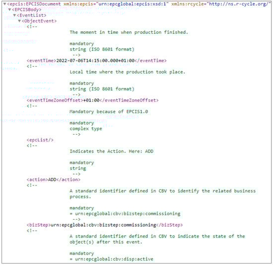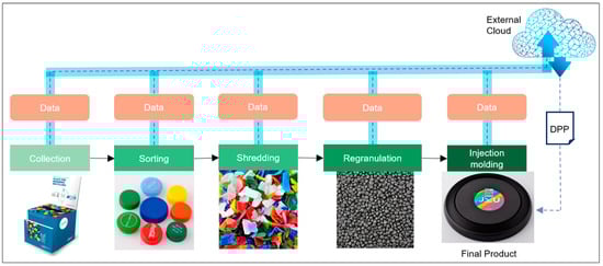 To demonstrate the traceability and use of a DPP in an open-loop plastics recycling process, a case study was conducted at the LIT Factory (Linz, Austria) to convert high-density polyethylene (HDPE) bottle caps into a frisbee disc end product [31]. Figure 1 illustrates the process steps from collection to end product. In addition to the material flow at each process step, information as a central element was created, collected, and communicated as a unique LGTIN for each event. For each process step, a predefined set of parameters was required and communicated to R-Cycle. The data for the DPP generation are stored on an external server and the data transfer per event was realized via a predefined XML file coded in Python. Figure 2 shows exemplary a part of the code for the transfer of data to R-Cycle.