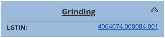 As a third process step, the sorted bottle caps were shredded into flakes on a Lindner Micromat 1500 industrial single-shaft shredder located at LIT Factory in Linz, Austria. All relevant process data were collected in five different categories, a unique LGTIN was created, and data were provided for DPP creation. Figure 5 shows the product tree for this grinding step and Table 2 presents the corresponding product data [31]. At this stage, information from the sorting step of all 20 batches is combined into one dataset for the grinding step.