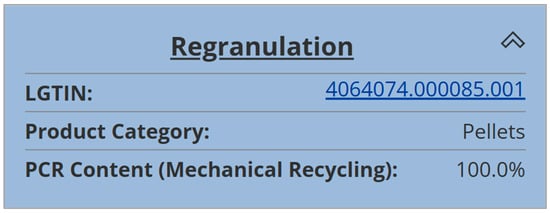 To evaluate the product quality, after the regranulation step, samples were taken, prepared, analyzed, and reported by Akhras et al. [14] using different analytical and mechanical tests. A part of these results is presented in the product data table as voluntary information to increase the value of the finally produced DPP. If more quality data are available, it can be added additionally to the respective DPP.