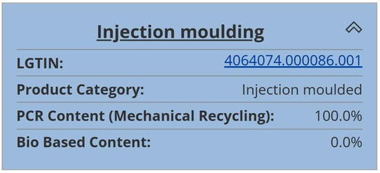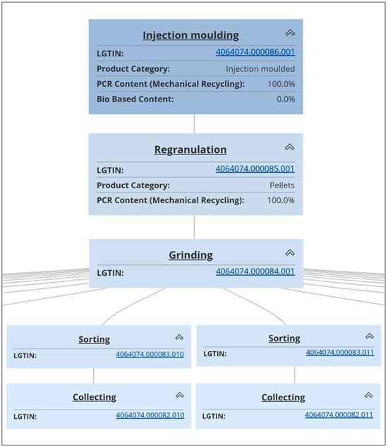 An additional goal of this demonstration project was to raise awareness of the circular economy among young people. Therefore, a collection competition was launched in schools and other educational institutions in Upper Austria with 19 participants and 103 collection boxes distributed, resulting in a material yield of about 251 kg. To ensure the operation of a mechanical recycling process on a semi-industrial scale, an additional 235 kg of HDPE bottle caps from separate collections were provided by LAVU (OÖ. Landes-Abfallverwertungsunternehmen GmbH, Wels, Austria). For each participant, a separate collection event represented by a unique LGTIN was created, and the necessary data and information in three different categories were collected, transferred to the R-Cycle server, and used as input for subsequent process steps [31]. Figure 3 shows the product data and product tree for the Lot 11 collection as an exemplary dataset.