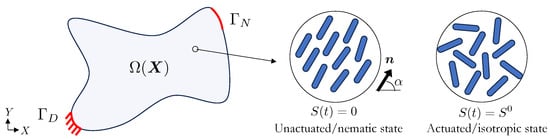 The initial order parameter indicates the highest possible level of ordering, while models the transition from the unactuated/nematic state to the actuated/isotropic state , cf. Figure 1. Normally, S is controlled by an external actuation mechanism, e.g., thermal, cf. [36,46]. Without loss of generality, we have omitted such dependence, i.e., S evolves by a prescribed update strategy.