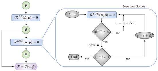 The nonlinear Equation (6) is solved using the iterative Newton–Raphson method. In this method, if the residual of the current solution guess is not converged, i.e., if for a small tolerance , then the next guess becomes , where solves the linear equation