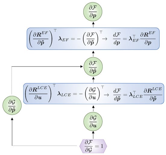 We traverse the graph in Figure 2 backwards to compute the gradients needed for optimization via the adjoint method, cf. Figure 3. The adjoint method is used due to its computational efficiency for the design problems considered here since the number of response functions is far less than the number of design parameters; for details, the reader is referred to [21,22,58].