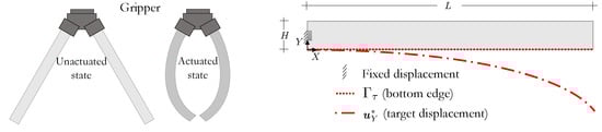 In this first example, we optimize the LC orientation of an LCE soft gripper to obtain a desired shape change when actuated, cf. the unactuated and actuated configurations in Figure 4. Using domain symmetry, we assign to the rectangular unactuated configuration of size [mm] by [mm], which is clamped over the middle fifth of the left edge. The order parameter is then decreased to zero to obtain the target actuated configuration such that the displacement of the bottom edge is .
