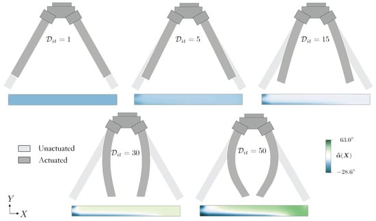 A smooth evolution of the design is observed in the plot of Figure 12, which illustrates iterates in their unactuated states and their LC orientations. The initial and optimized designs are presented at the bottom of Figure 12. In the optimized design, the top and bottom legs curve in the Z-direction, while the inclined legs near curve in the -plane. In addition, the horizontal leg at the center is tapered inwards. Modest shape changes are observed in the remaining sections. The LC orientation field aids in the actuation by defining adjacent regions with drastically different alignments.