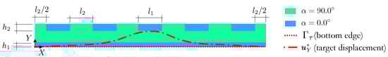 The orientation field is piecewise uniform over the finite elements and the element angle orientations are the design parameters subject to the limits and . This design field is filtered according to Equation (4) using only homogeneous Neumann boundary conditions to obtain , which is also piecewise uniform over the mesh (after performing the appropriate projections discussed above). Hence, each element has its own orientation . Similarly, the shape parameters are filtered by solving Equation (4) with its corresponding energy function to obtain . Lower and upper limits and for the shape parameters and the boundary (see Equation (5)) are provided below per case study.