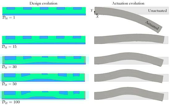 Snapshots of the design at iterates on the left side of Figure 7 show noticeable shape variations that favor more LC mesogens oriented at near the center of the bottom edge, i.e., the bottom region thickens in a nonuniform manner. The shapes of the top rectangles change independently to further optimize actuation performance, i.e., they grow near the inflection points of to aid in generating the desired deformation. The undeformed and actuated LCE strip configurations for the initial and shape optimized designs shown on the right side of Figure 7 clearly illustrate that controlled shape changes of the material interface can generate considerable actuation response. This example also demonstrates how the optimization can accommodate fabrication constraints, like restricted LC orientation choices, while still leveraging the design freedom offered by 3D printing technologies.