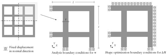 We consider the two-dimensional representation of the log pile lattice structure illustrated in Figure 8. Only a quarter of the cell domain with length [mm] and thickness [mm] is simulated. Rollers along the left and bottom boundaries are applied to enforce domain symmetry in the analysis; and rollers along all external boundaries are applied to the shape filter (i.e., in Equation (5)) to limit the shape changes within a confined subregion in the optimization. The LC orientation and shape optimization maximizes the energy absorbed by the lattice in the actuated state while maintaining a constant volume, i.e.,