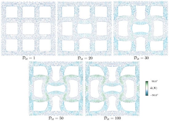 To formulate a well-posed optimization problem, the design fields are filtered to prevent highly oscillatory orientations and complex shapes [55,56]. Thus, we optimize the parameters , but we model the structure using the filtered parameters that define the filtered orientation and shape perturbations .