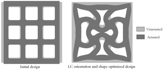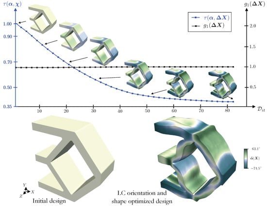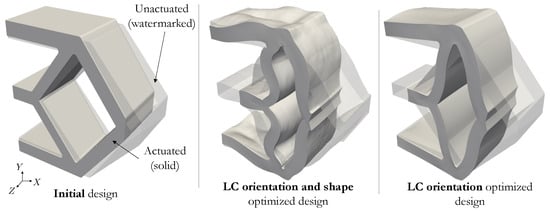 The strain energy density is defined in Equation (1), is the volume of the evolving design, and is the volume of the initial design. Both the LC orientation and shape design parameters are filtered as explained above. The lower and upper limits of the shape parameters are , and , respectively.