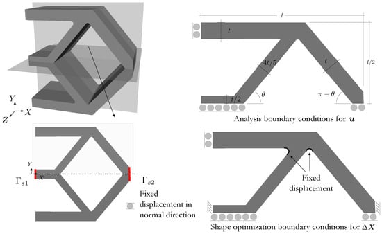 Compliant mechanism design problem: planes of symmetry in 3D domain (top left), cross-section (bottom left), and onsets detailing the boundary conditions for the analysis for (top right) and shape perturbation for (bottom right).