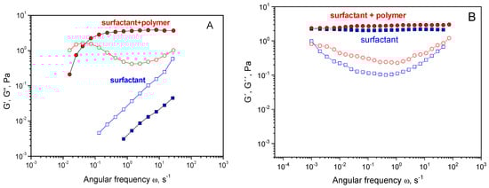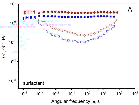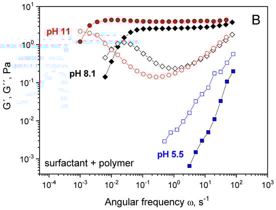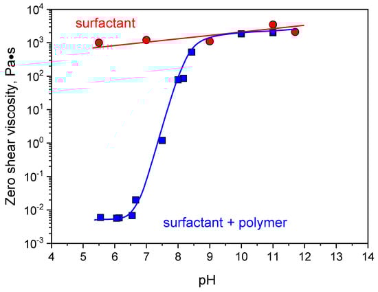 - Shashkina, J.A.; Philippova, O.E.; Zaroslov, Y.D.; Khokhlov, A.R.; Pryakhina, T.A.; Blagodatskikh, I.V. Rheology of Viscoelastic Solutions of Cationic Surfactant. Effect of Added Associating Polymer. Langmuir 2005, 21, 1524–1530. [Google Scholar] [CrossRef] [PubMed]
