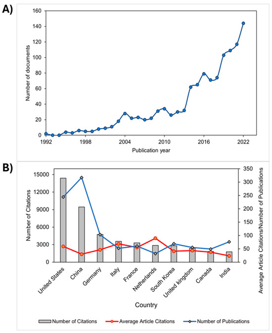 On another note, countries with the highest scientific production in polyelectrolyte studies were categorized (See Figure 2B). It was found that the United States showed the highest contribution in citations (14,384), followed by China (9450) and Germany (4763). Additionally, these countries exhibited the highest number of publications with 244, 317, and 103 documents, respectively. Therefore, the leadership in research on polyelectrolytes in medical, environmental, and agricultural applications by these three countries is notable. Moreover, the positive impact generated by these publications in the field of study and their likely use as important references for other innovative developments can be inferred. It is worth noting that the categorization was conducted based on the nationalities of the corresponding authors.