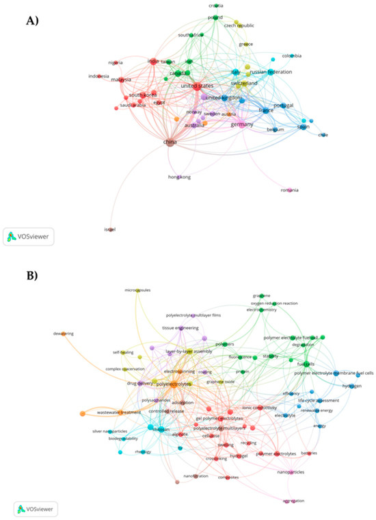 The co-authorship and co-occurrence analyses were conducted with the purpose of investigating a broad spectrum of issues such as scholarly communication, research front, and the intellectual structure of research fields and to study cross-disciplines related to the topic of polyelectrolytes [25]. Additionally, Liu and Mei [26] claimed that the use of these analyses enhances the ability of quantitative techniques to represent the structural and dynamic aspects of scientific research. They also make it possible to identify and link the specialized literature not only within a given period but also over time. Figure 3A depicts the collaboration network among countries in studies on polyelectrolytes and their applications. It was found that the United States exhibited the highest cooperation in research, with a network consisting of 11 countries. Additionally, it was identified that this network is interconnected with the one led by China. It is noteworthy that the United States and China were the leading countries in scientific production on the topic. The results presented demonstrate the relationship between the researchers and their respective institutional affiliations, highlighting scientific cooperation in the production of novel materials based on polyelectrolytes capable of generating new developments and applications in the fields of medicine, agriculture, and the environment.