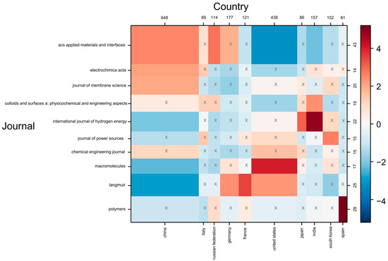 The contingency matrix involved an analysis that allowed the identification of the correlations between the bibliometric parameters. The matrix was developed to visualize the relationship and magnitude of co-occurrence between the leading countries in the polyelectrolyte scientific publications and specialized journals. The colors indicated the degree of correlation between two variables under the measure of a statistical co-occurrence metric Chi-square. On the numerical scale, a value of four indicated that the observed co-occurrence was 400% higher than the expected value (See Figure 4). Conversely, a value of −4 showed that the observed co-occurrence result was 400% lower than expected. The matrix presented white cells indicating that the variables had no relationship (neutrality). Additionally, negative correlations were observed through blue cells, while red cells signified a strong relationship [27]. Figure 4 displays the correlations between the most relevant journals and countries in the scientific production of polyelectrolytes and their applications. The matrix indicated that the United States had a correlation of four with the journal “Macromolecules” (Q1), meaning there were four times more articles assigned between these factors than would be expected if the co-occurrence distributions and semantic groups were independent [28]. Also, a correlation of three was observed between China and the journal “ACS Applied Materials & Interfaces” (Q1). It is noteworthy that “Macromolecules” and “ACS Applied Materials & Interfaces” are journals of the American Chemical Society, indicating the high quality of publications produced by these countries.